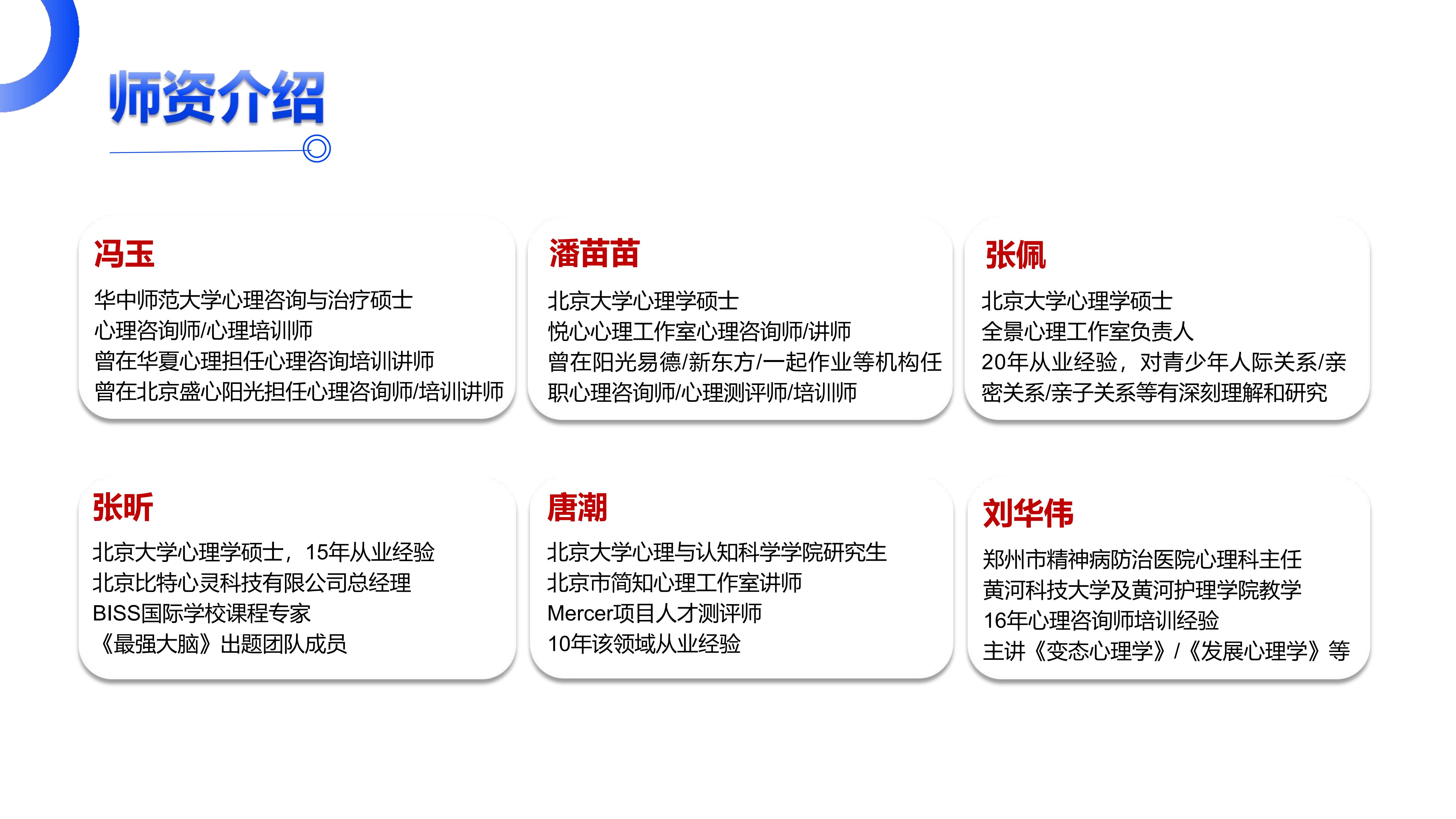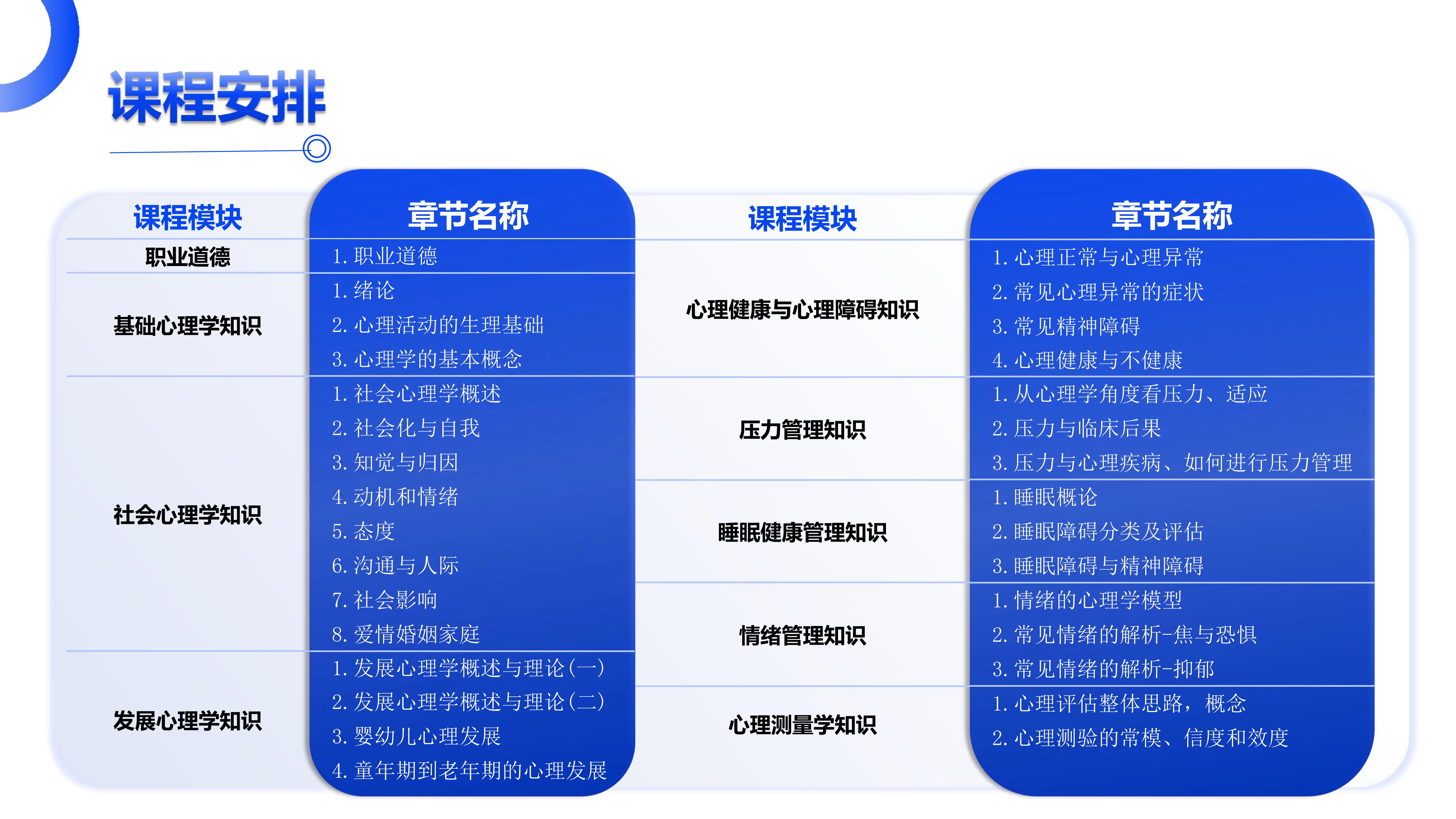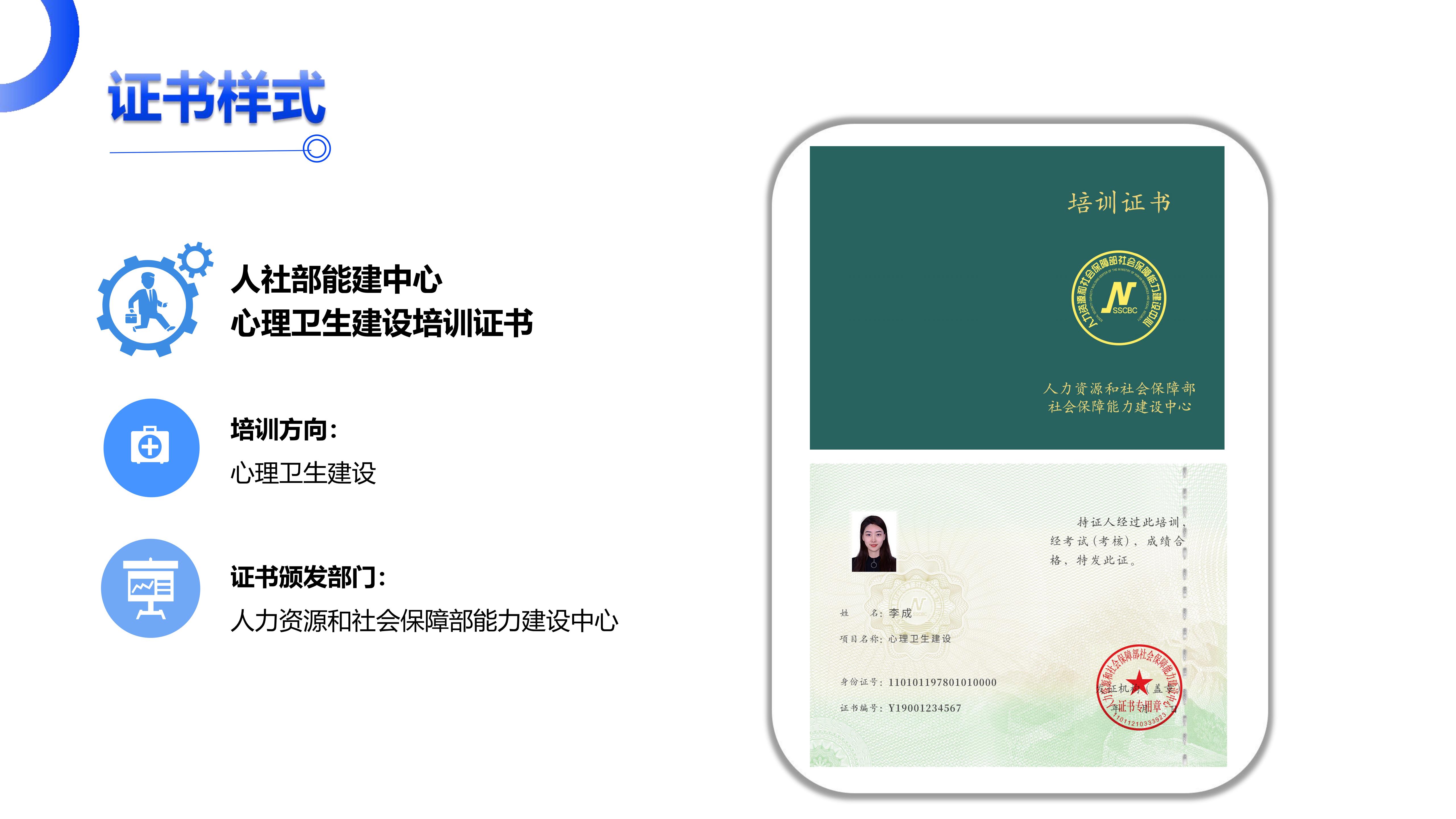 人社部取消心理咨询师职业资格考试后,社会各界学习心理健康知识和心理咨询技术的热情依然高涨,广大心理培训机构和心理学爱好者希望有一种心理咨询师统考培训的替代产品,继续承担起普及心理学知识、培养入门型心理服务人才的任务。根据社会需求,人社部建能中心开发了心理卫生建设培训证书项目,培训方向:心理卫生建设。证书颁发部门:人力资源和社会保障部能力建设中心。继续满足社会各界学习心理健康知识和心理咨询技术的入门需要。有志于从事心理服务工作的学员,通过参加本项目合作机构组织的培训课程的系统学习,可以为未来的专业成长和职业发展打下基础。
